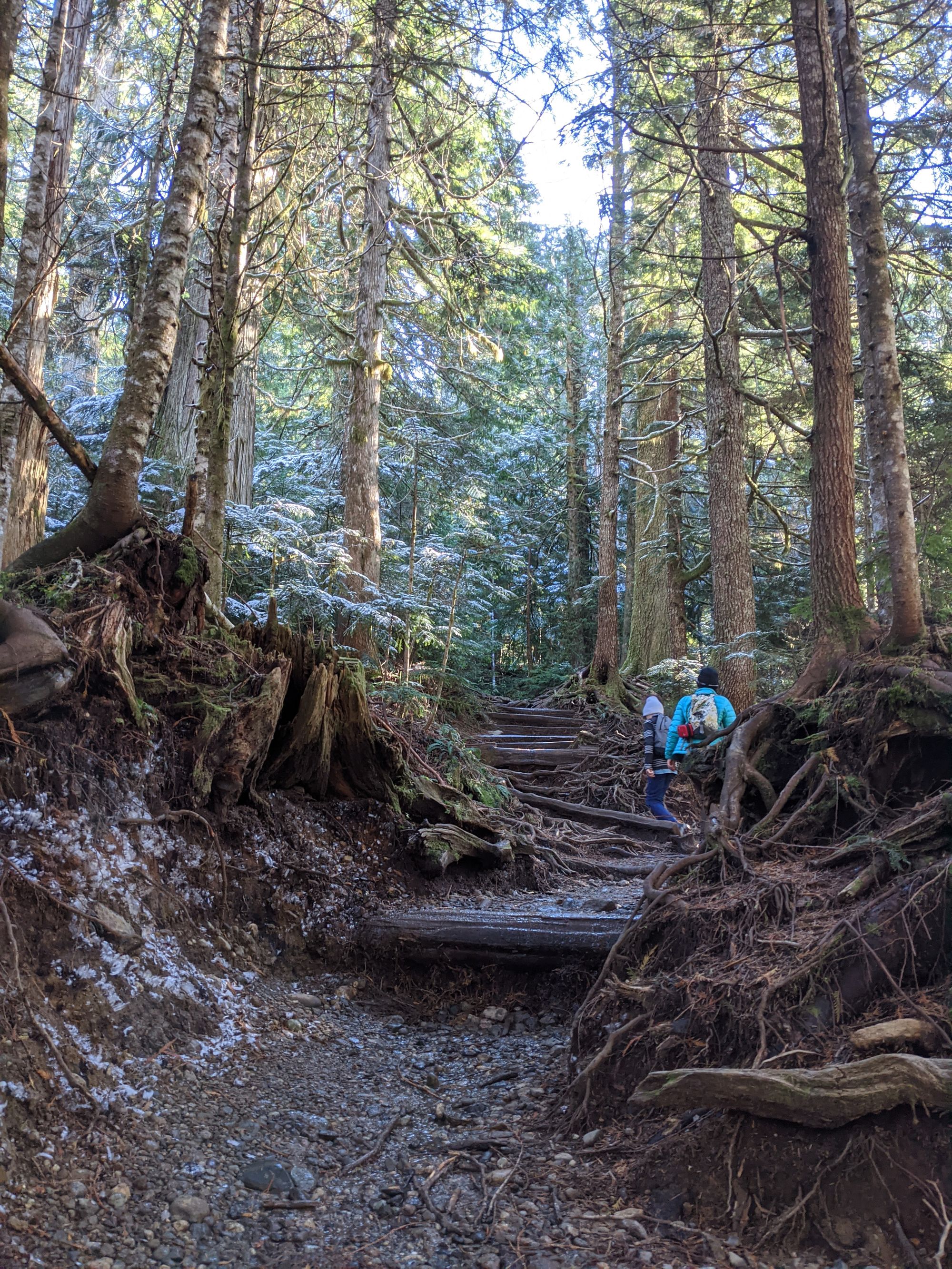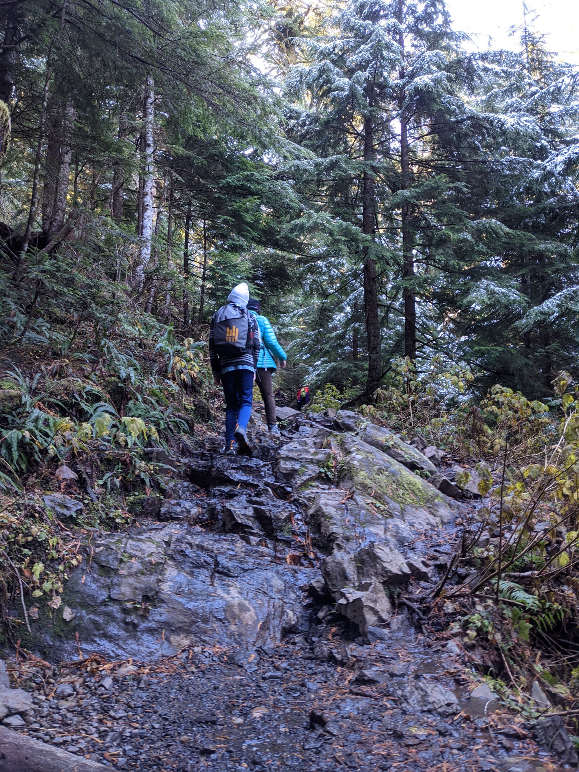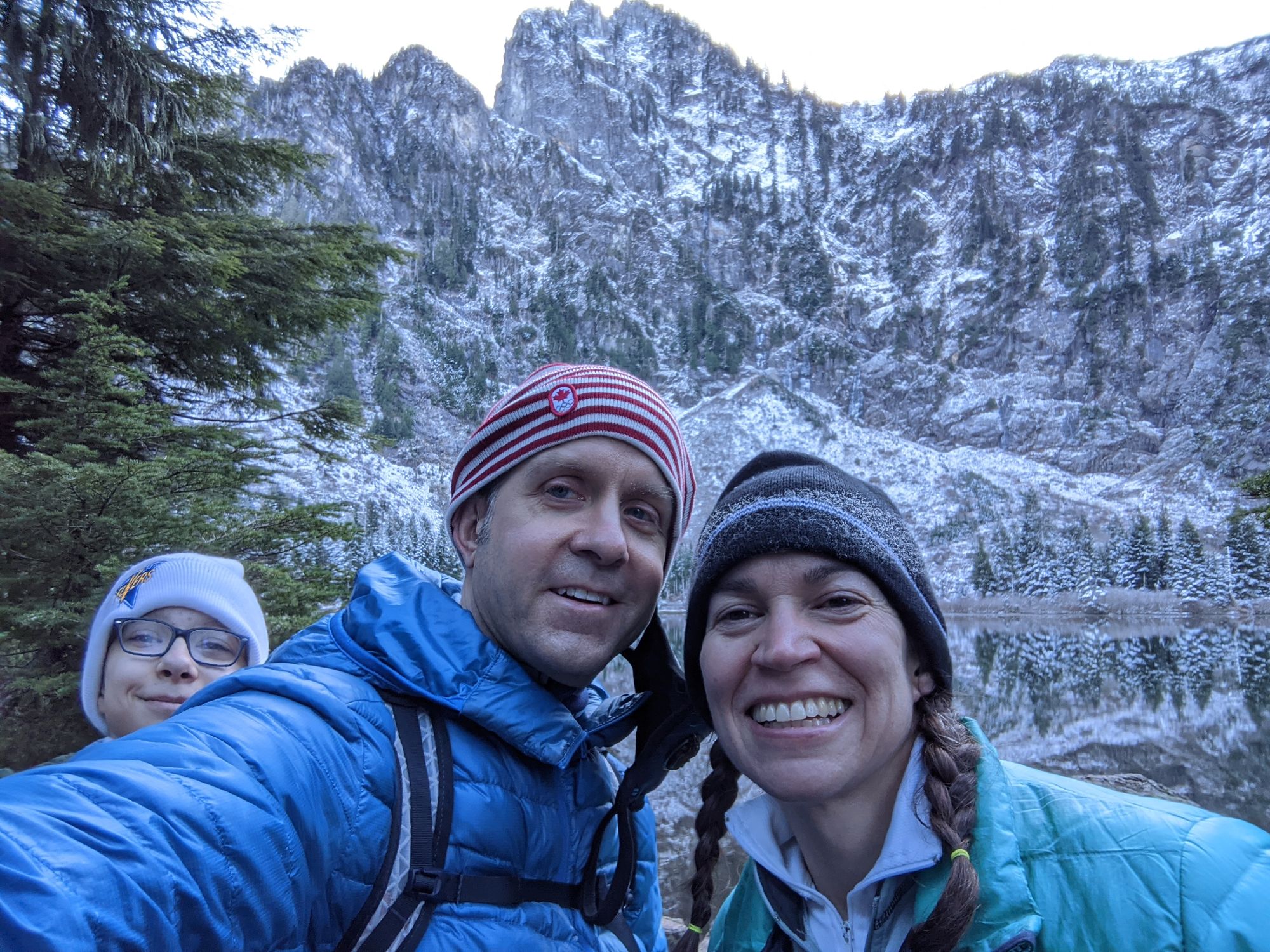 A moderate hike today to Heather Lake outside of Granite Falls. The trail was more like a creek bed most of the way consisting of rocks, exposed roots and trickling water. Add in a bit of frost on the ground and things were a bit slippery but the hike was worth it with a wonderful lake just slightly above the snow line.