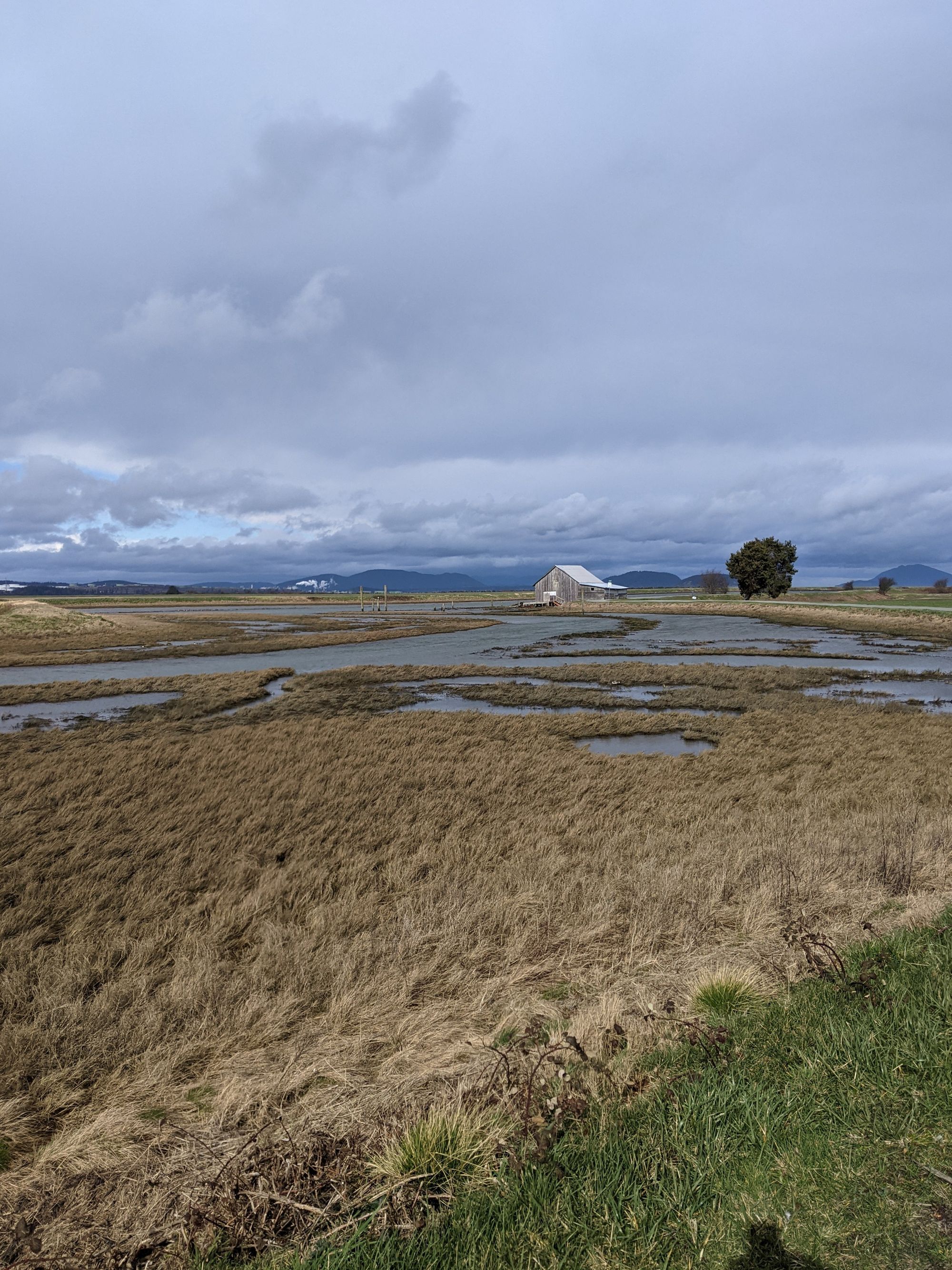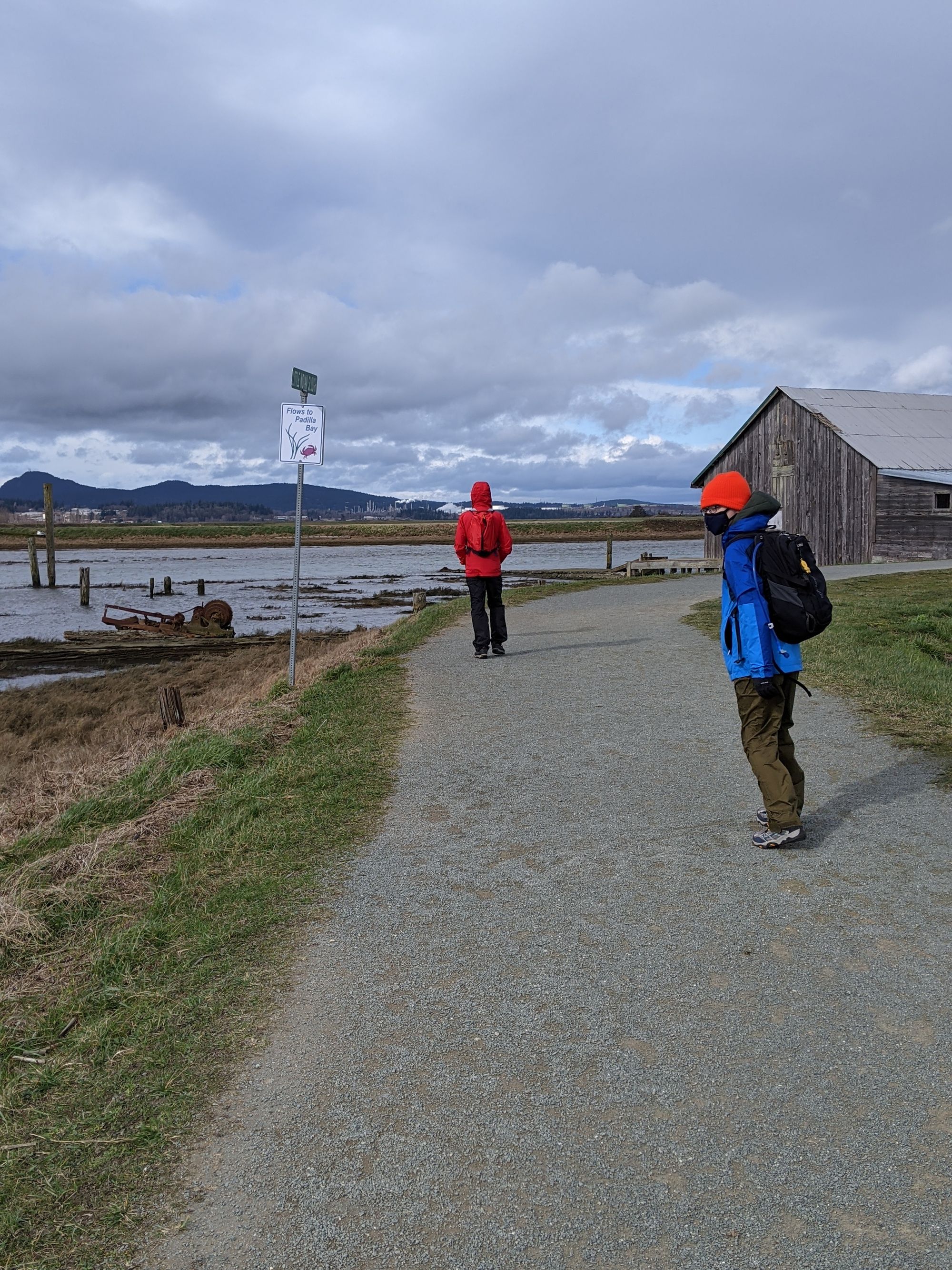Probably better described as a walk instead of a hike we hit a short, flat trail at Padilla Bay where the Skagit River meets the Salish Sea. The robust wind made the walk seem like it was uphill but our rain gear provided enough protection against the wind to make it easy to check out the various birds and water fowl.